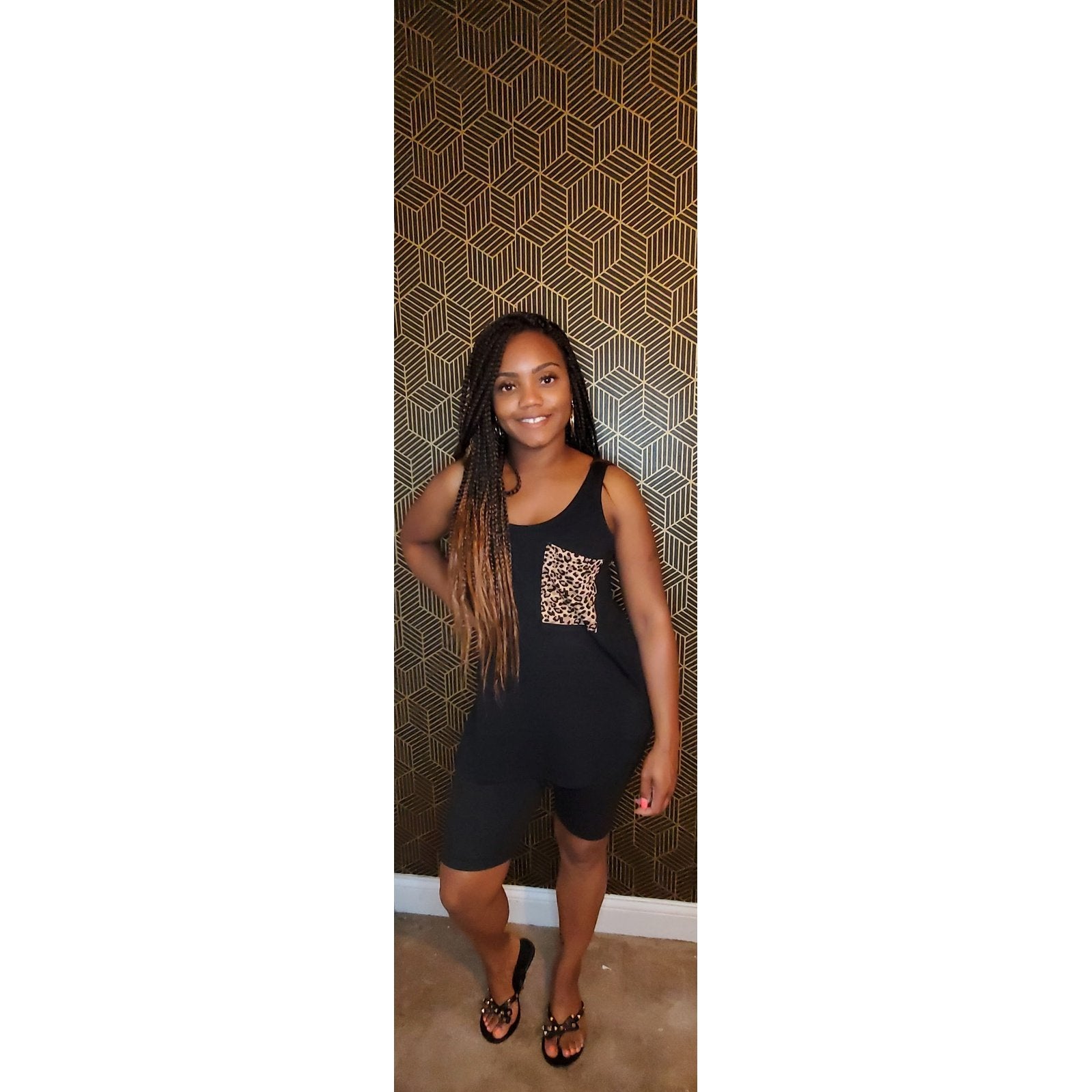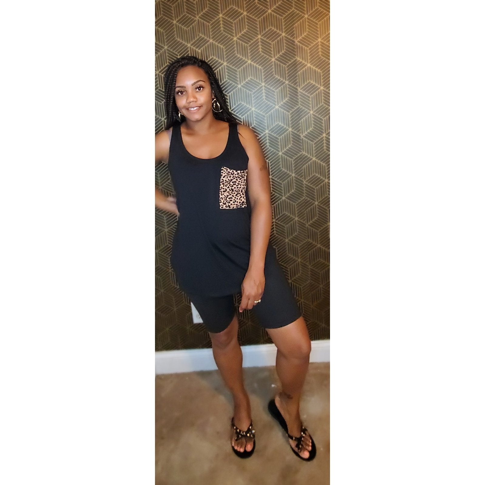 This set has a solid colored tank top with leopard pocket and matching biker shorts.