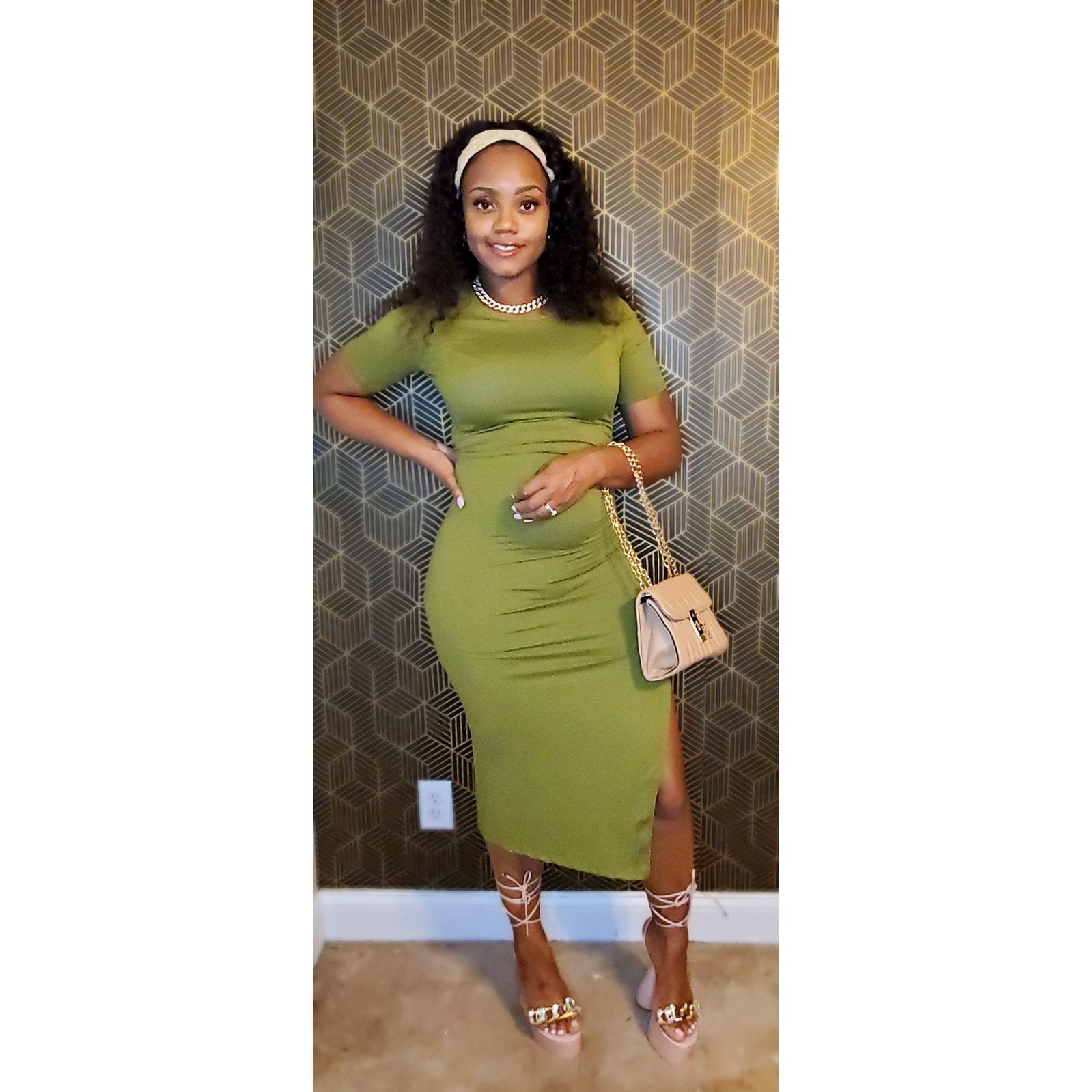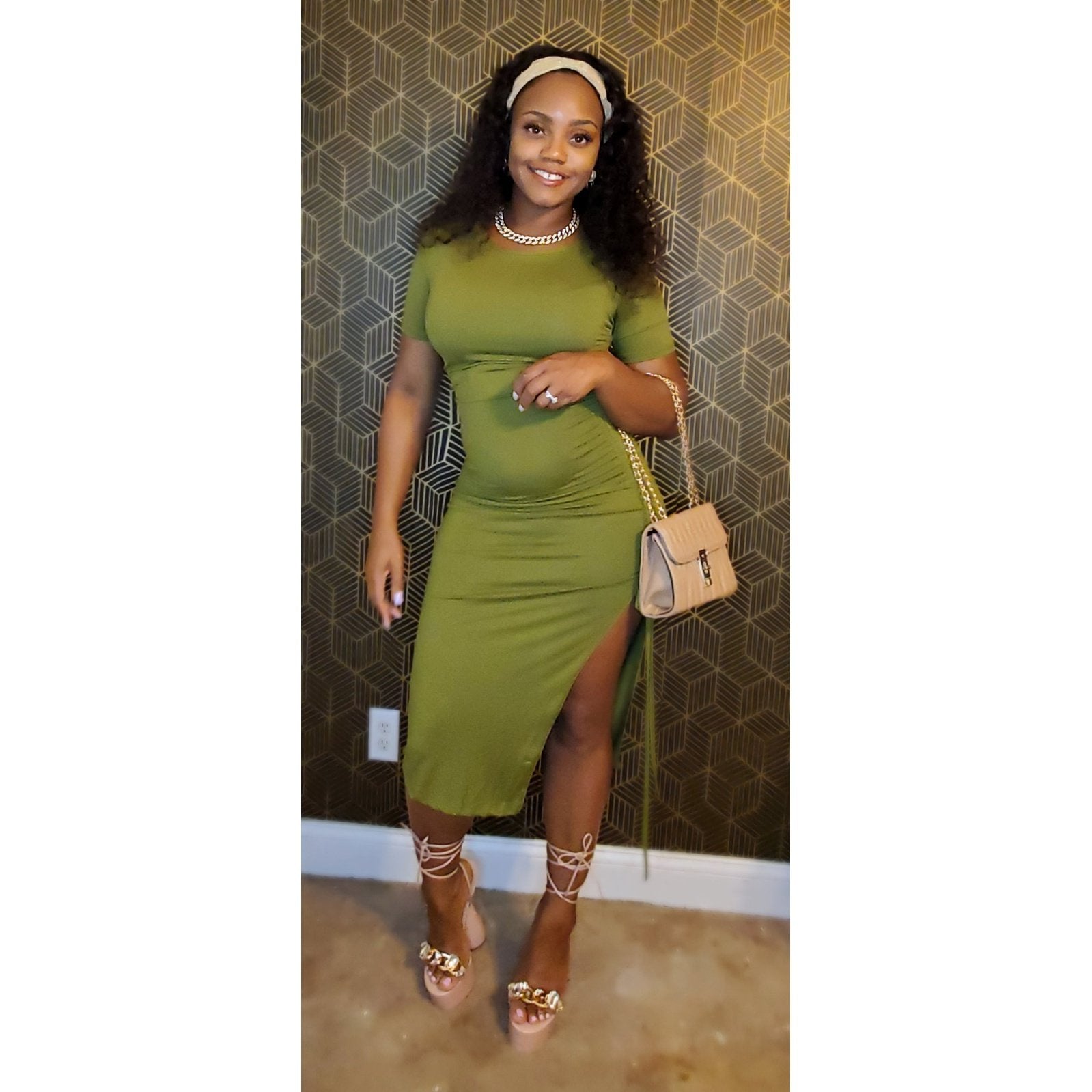 Drawstring ruched side slit midi dress.